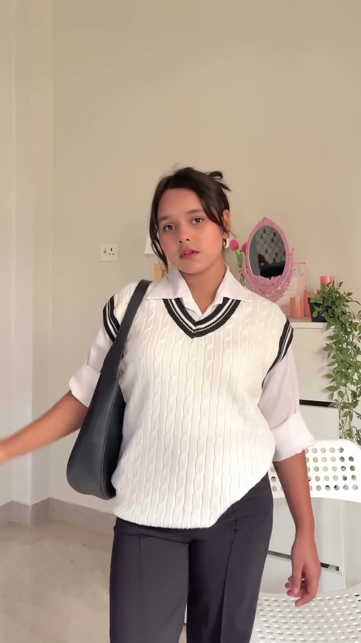 🤍 White Cable Vest: White cable-knit sweater vest layered over a collared shirt + black pants + black shoulder bag